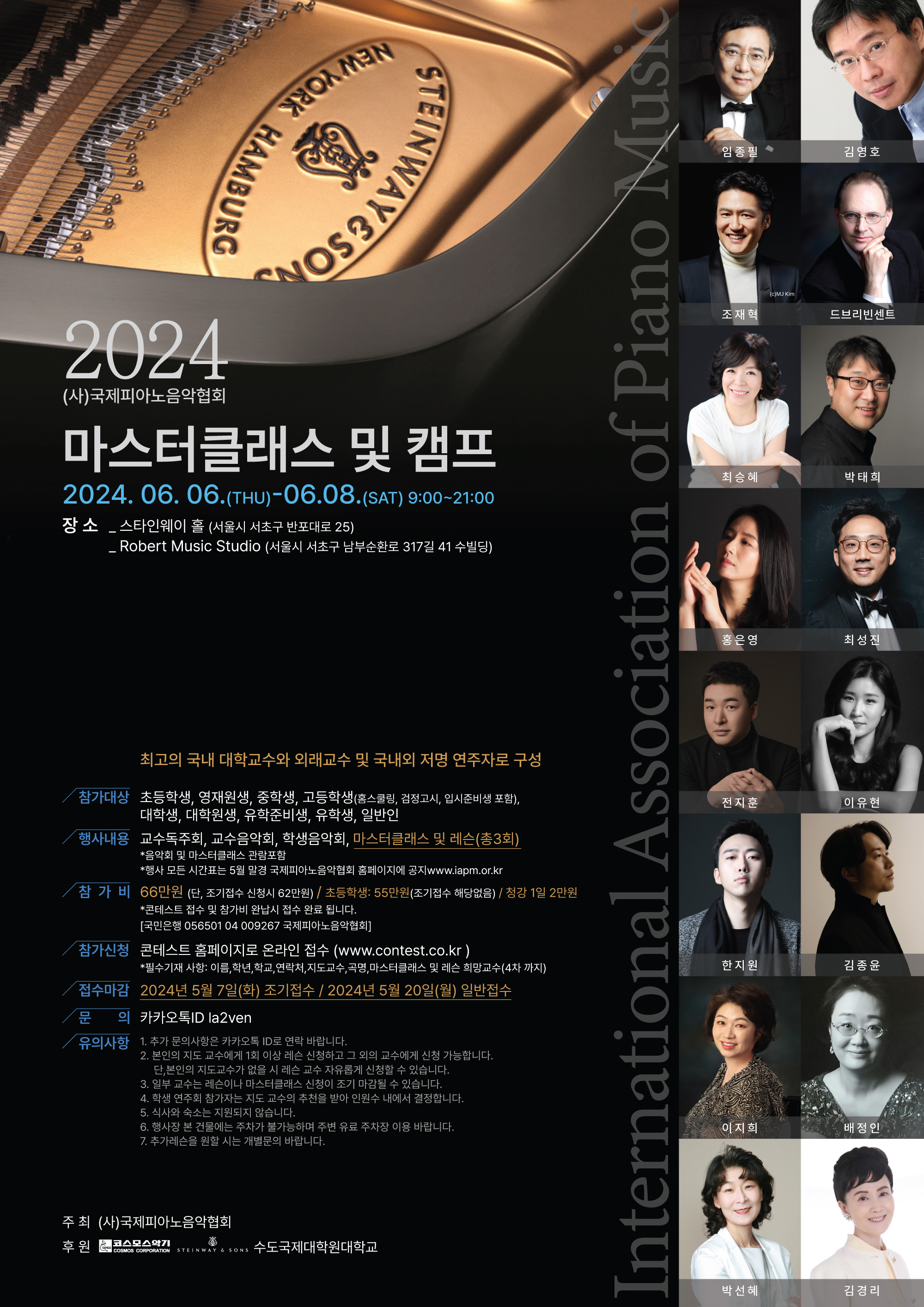 2024년 6월 6일(목) ~ 6월 8일(토), 3일간 시간 : 9시 ~ 21시 장소 : 스타인웨이홀 주최 : (사)국제피아노음악협회 후원 : (주)코스모스악기 스타인웨이앤선즈 수도국제대학원대학교